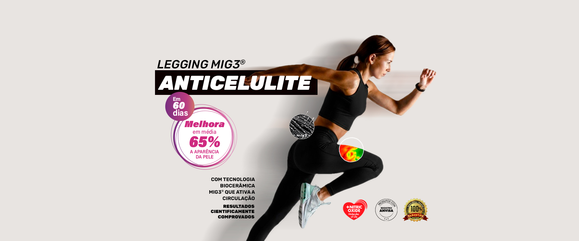 A qualidade, eficácia e segurança na redução da celulite graus II e III, das Bermudas e leggings MIG3® Actiive Shorts são reconhecidas pela ANVISA / Ministério da Saúde.